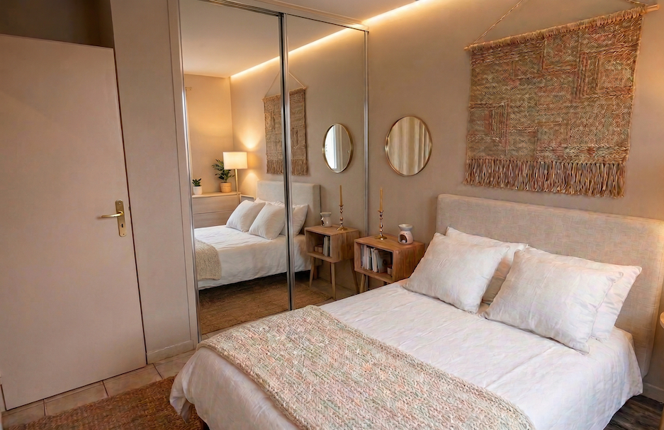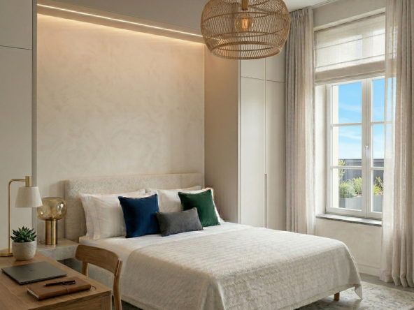 Chaque chambre est une invitation au bien-être, équipée d’un lit double (140 cm), d’un bureau ergonomique et de nombreux rangements.