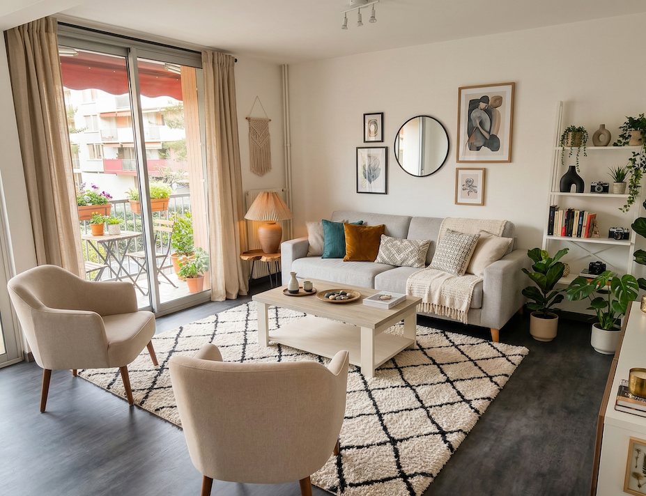 - Le Salon / Séjour : Un espace de vie moderne et chaleureux avec canapé et fauteuils confortables, idéal pour vos moments de détente et d’échanges.